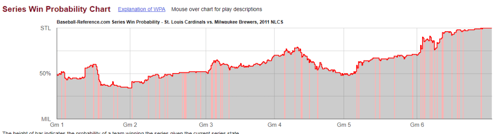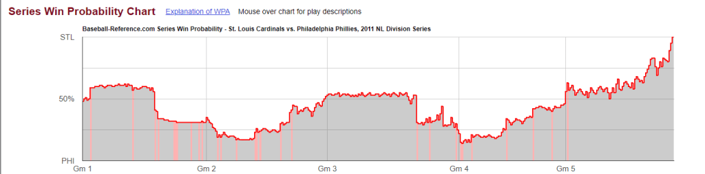 The Cardinals had to take on the 1 seed Philadelphia Phillies, which had won 102 games that season. Names like Cliff Lee, Roy Halladay, and Cole Hamels in their starting pitching staff. The Phillies were also coming off of back to back World Series trips, winning in 2008 and losing in 2009. Game 1 was Roy Halladay vs Kyle Lohse, Game 2 Cliff Lee vs Chris Carpenter, Game 3 Jaime Garcia vs Cole Hamels, Game 4 Roy Oswalt vs Edwin Jackson, and Game 5 Roy Halladay vs Chris Carpenter. Leading into game 5, the run differential was +3 in favor of the Phillies 21-18. Enter in Chris Carpenter on short rest vs HOF Roy Halladay. Game 5 was one for the ages, in terms of a pitching duel at that time. Knowing what was on the line, La Russa played the hot hand and put in Carpenter over Lohse. The Cardinals scored one run, in the first inning after a Rafael Furcal triple, and a Skip Schumaker double to drive him in. That. Was. It. Only 1 run in Game 5 of a playoff series. That’s because Roy Halladay then settled in only giving up 6 H, 1 ER, 1 BB and 7 SO over 8 IP. Which in 97% of games is going to win you the ballgame. Unless you have Chris Carpenter going 9 IP, 3 H, 0 ER. Tony La Russa took a gamble throwing Carpenter on short rest, but Carpenter only threw 3 innings in game 2. Giving up 5 H and 4 ER in those 3 innings. So it was a gamble in more ways than one, and it paid off, big time. The final run differential was 21-19 in favor of Philadelphia, mostly from that 5 run win in game 1. The Cardinals clawed and scratched their way through a Phillies team trying to go to 3 straight World Series. The big diffference being St. Louis’ team OPS being .703 to Philadelphia’s .604. Even though St. Louis posted a 4.09 ERA to Philadelphia’s 3.89, it was enough to advance. St. Louis’ starting pitchers combined for 30.1 IP and the bullpen covering the other 13.2 IP, together posting a 1.023 WHIP for the series. Cardinals’ batters had 15 XBH in the 5 games, 10 2B, 3 3B, and 2 HR. Philadelphia only having 11 XBH, 7 2B, 1 3B, and 3 HR. The Series win probability chart looks like a lie detector test with how this series went: