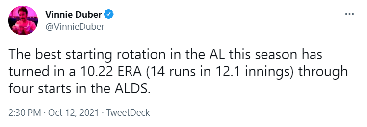We can get into this all day, but the other failures lie with the starting pitching staff in the playoffs. Lance Lynn, Lucas Giolito, Dylan Cease, and Carlos Rodon; started the 4 games for the White Sox. Collectively they posted a 3.57 ERA in the regular season as a starting staff (with Dallas Keuchel). However, between the 4 pitcher in the postseason their ERA was a whopping 10.22 ERA in 12.1 IP. The only pitcher to make it to the 5th inning was Lucas Giolito going 4.1 IP, 3 H, 5 BB, and 4 ER. Walks were the killer for the entire pitching staff against a very disciplined and smart Astros team. The Sox issued 41 BB in 34 IP. That is absolutely awful from what was the 2nd best pitching staff in baseball in the regular season. The staff posted a 1.706 WHIP in 4 games and compare that to a 1.204 WHIP through 162 games, when not at full strength during the regular season. Dylan Cease had the worst ERA in the ALDS after pitching 1.2 innings and giving up 3 ER, with 3 BB. The Astros made the White Sox pay for every pitching mistake imaginable.