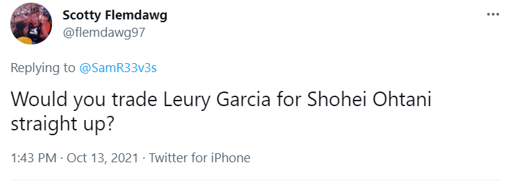 I answered him on Twitter stating that Leury Garcia can do more than Ohtani, so my answer was no. You can’t trade a great player like Leury for a one-off like Ohtani.