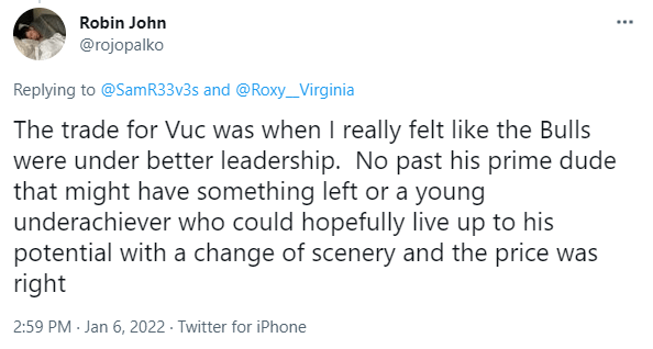 “Vooch’s 21 start is a great example of a player where people had set expectations not understanding the larger scope of play. In the 8 full seasons Vooch played for the Magic they were above .500 one time. He led in rebounds every season and points for 5 of them. So now you’ve plucked arguably the stat leader for a suboptimal team and dropped him on a team with playoff opportunities and (now) LaVine, DeRozan, and Ball. An almost 180 in terms of playing style and requirements. Vooch is no longer required to put up 20/12 a night because he has 3 primary scorers along with him who will handle the bulk of the scoring. You also take Pat Williams out of the equation and you are the lone big man, another aspect of the game to work through.”