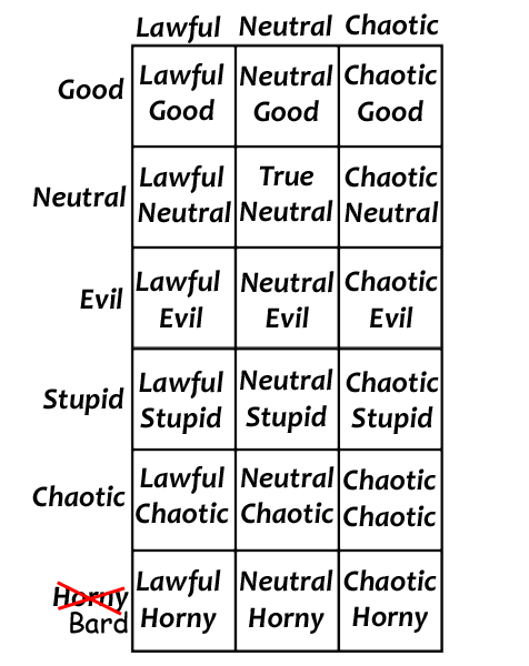 Everyone is familiar with the classic alignment chart which ranks components of various categories from Lawful Good to Chaotic Evil. If you’re not familiar, you’re stupid, but below is the chart for reference.