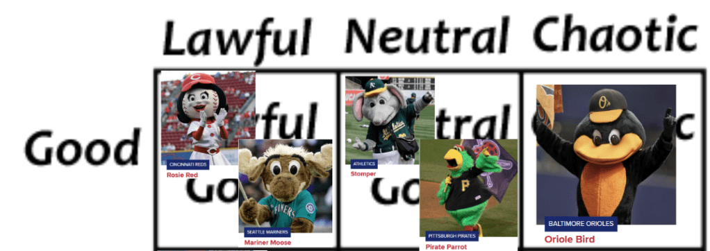 While watching the chaotic pierogy race at PNC Park last weekend, a few of us ASS members thought it would be a fun idea to align all 27 MLB Mascots* based on their vibes. But of course, we don’t do anything the conventional way. So for this exercise, we are using this handy dandy chart someone from Reddit.com made: