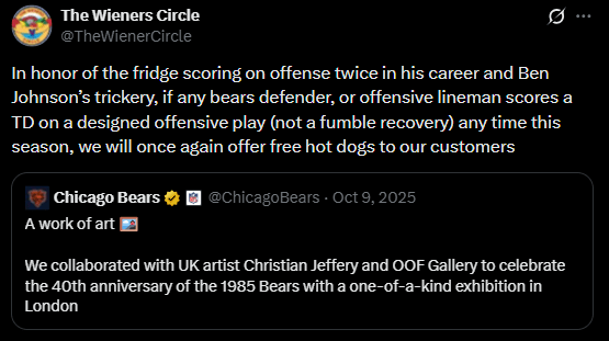 The Wieners Circle again took to Twitter/X and provided the next context for a hot dog giveaway. They want an offensive lineman or Bears’ defender to score on a designed play. To this point, that has yet to happen, but hey, week 18 is still out there!