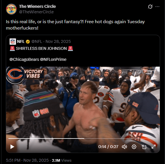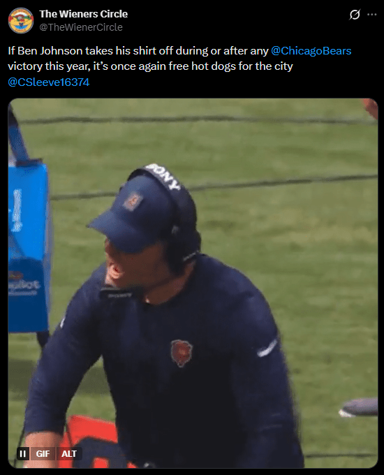 The players were here for it when asked about it by the Chicago Bears’ beat writers. Ben Johnson was taken aback by anyone wanting to see that. Ben Johnson is a very reserved and focused coach. Getting him to do something as silly as take his shirt off after a win is quite the challenge. Fast forward to “Black Friday,” the Chicago Bears defeated the Philadelphia Eagles, and lo and behold: free hot dogs for the city.